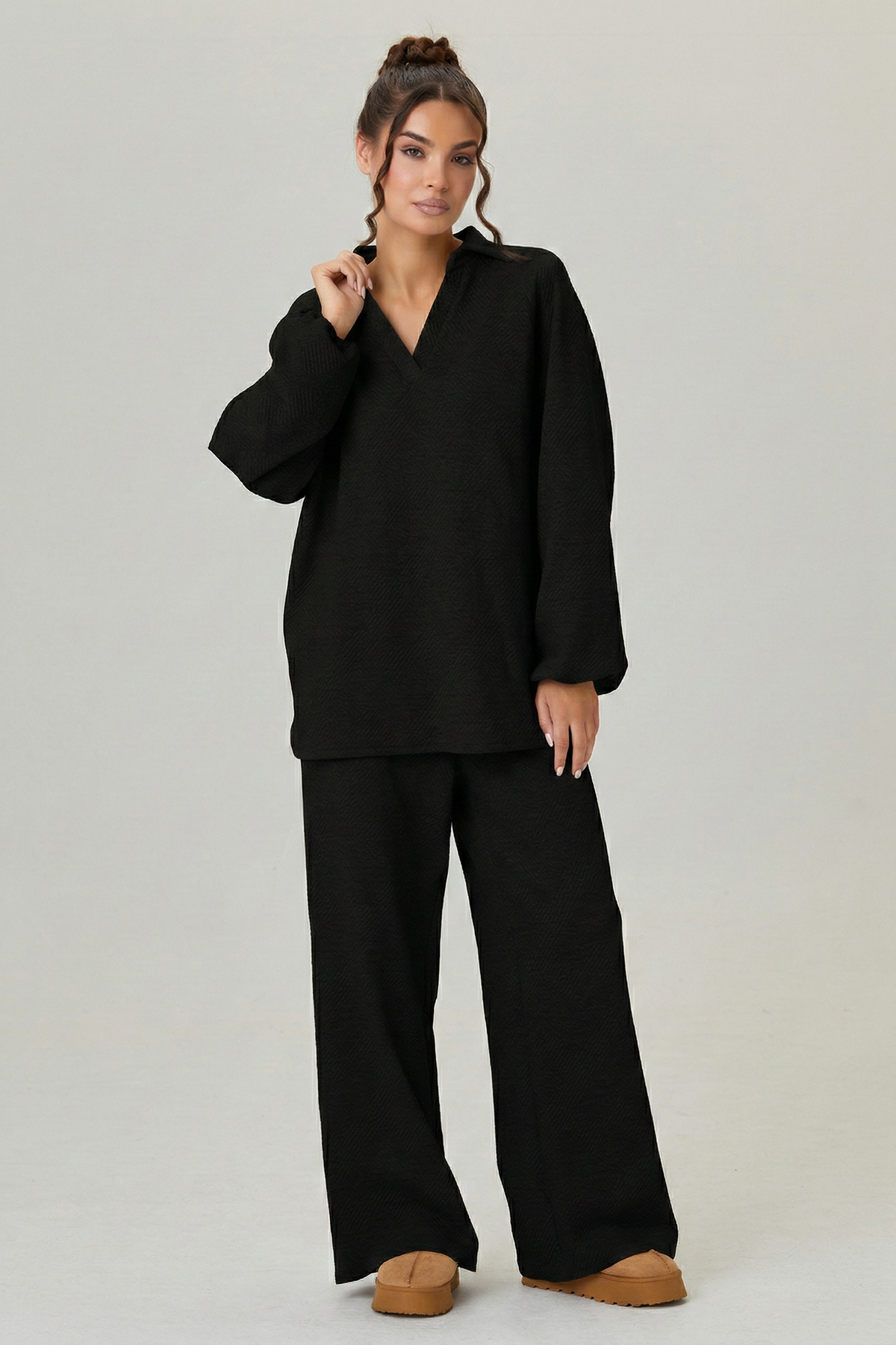 KatchMeUK Women's Slouchy Solid Color V-Neck Loose Textured Pullover & Drawstring Waist Trousers Co-ord, Minimalist Two Piece Outfits, Soft Womenswear